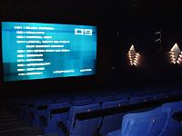 Wir haben den Testlauf natürlich in Kino 6 gemacht, dieser Saal wird es ja sicher werden, wenn nun nicht doch noch eine Menge Anmeldungen uns in den größeren Saal darunter 'vertreibt'. Der Saal hat 183 Plätze. Hier ein Eindruck vom leeren Raum, das E Cinema System wirft gerade das blaue Menü auf die Leinwand, oben rechts parempa mit dem Filmvorführer.