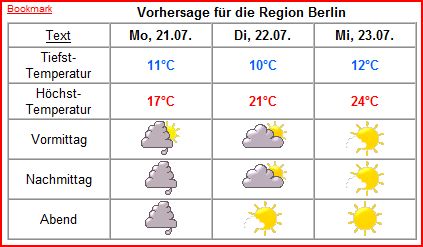 Temperatur 11°C 11°C 12°C Höchst- Temperatur 17°C 21°C 25°C Vormittag http://www.wetteronline.de/daten/sym...ard/wbs1__.gif http://www.wetteronline.de/daten/sym...ard/wb____.gif http://www.wetteronline.de/daten/sym...ard/ms____.gif Nachmittag http://www.wetteronline.de/daten/sym...ard/bws1__.gif http://www.wetteronline.de/daten/sym...ard/wb____.gif http://www.wetteronline.de/daten/sym...ard/ms____.gif Abend http://www.wetteronline.de/daten/sym...ard/bws1__.gif http://www.wetteronline.de/daten/sym...ard/ms____.gif http://www.wetteronline.de/daten/sym...ard/ms____.gif Nur so eben einmal die Wetteraussichten für Berlin :D:D:D |