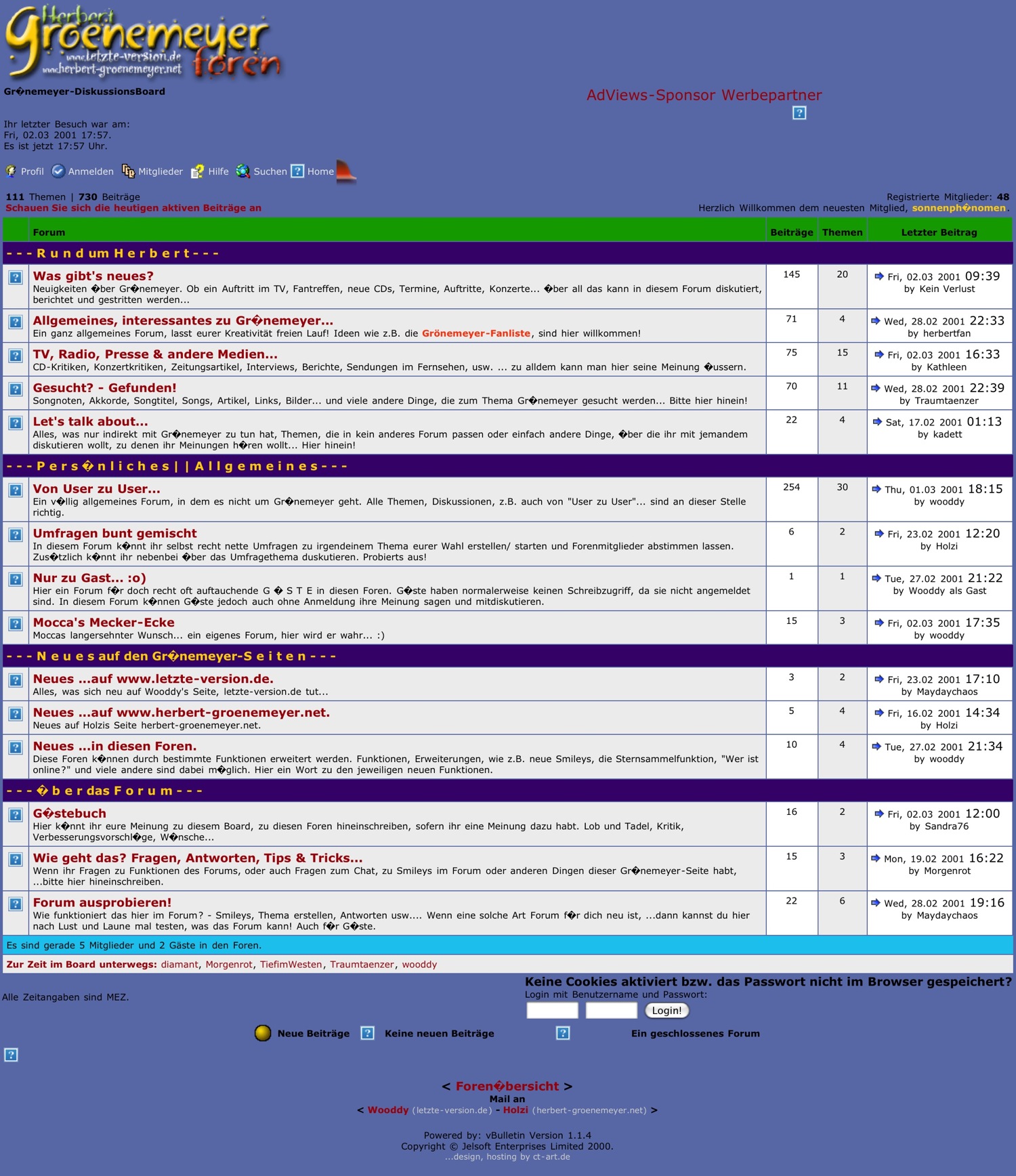 die webseite gibts seit oktober 2000, ein erstes forum gabs schon wenige wochen später. so sah die seite im februar 2001 aus: Anhang 4360 und das damalige forum sah so aus: Anhang 4362 Man beachte: "Registrierte Mitglieder: 48" und ein Sonder-Unterforum "Mocca's Mecker-Ecke" - nomen est damals schon omen! :mrgreen: |