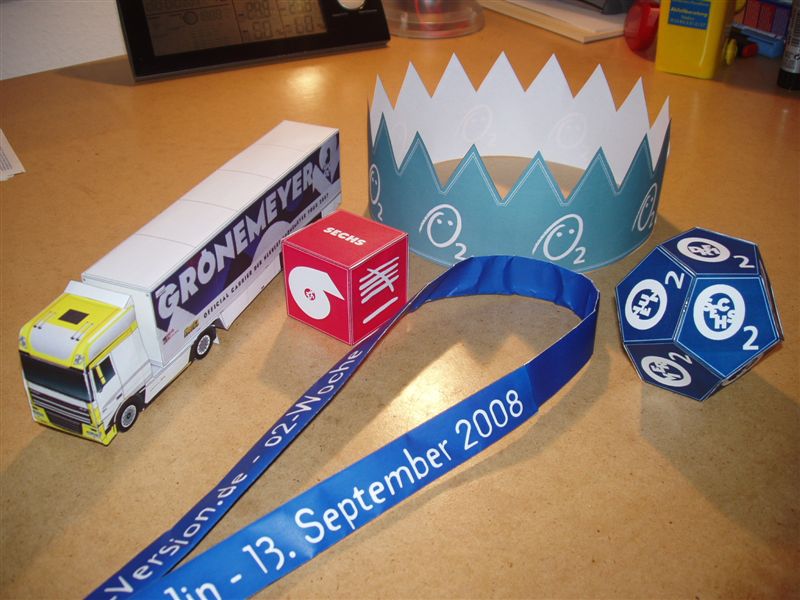 Aus Druckerpatronenmangel habe ich mir den Dodekaeder (den Zwölfflächner) im Kopierladen ausdrucken lassen, leider war es nur auf Papier möglich und nicht auf Pappe...und weil das nicht wirklich was geworden ist und Farbbilder dort verhältnismäßig teuer sind, habe ich mir mal ein eigenes handgemaltes Design für Krone und Hexaeder (Würfel wäre zu zweideutig, auch wenn die mit 12 Flächen eigentlich nicht Würfel heißen, aber gerne so genannt werden, wobei man auch gerne ein Quadrat als Kreis bezeichnen kann, ohne etwas falsches zu sagen) ausgedacht, bei dem ich jeweils die untergesetzte 2 der Ös weggelassen habe und die Würfelfläche mit der O6 habe ich der Farbgebung wegen durch eine Fläche mit dem allseits beliebten Sprünge-Männchen ersetzt...und weil ich keine funktionierende Digitalkamera habe, habe ich die 3 Objekte aus verschiedenen Perspektiven dreimal eingescannt, aber ich bringe das Zeugs auch gerne persönlich mit, wenn es denn zur Teilnahmeberechtigung führt...wie viele Lose ich nun dafür erhalte, überlasse ich der Jury, die das wahrscheinlich unter notarieller Aufsicht entscheidet!
