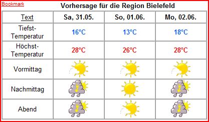 http://www.arminia-bielefeld.de/file...am/current.jpg Morgen früh soll es regnen, morgen Mittag soll es bewölkt sein und gegen Abend sonnig ;) (19-23° C /// 7h Sonne /// Regenrisiko 42%) |