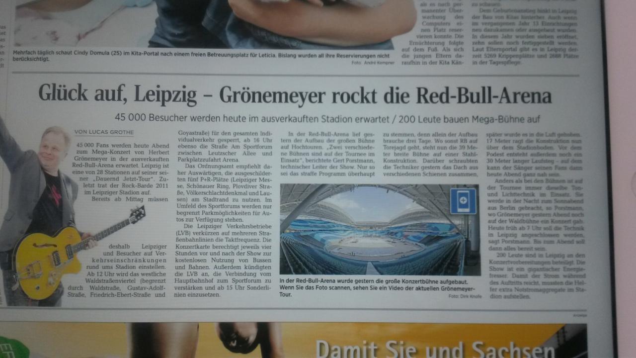 Tanzbereit dabei sind bisher folgende 57 LV-User, die sicher für jede Menge Stimmung in der Red Bull Arena sorgen werden: Alkohol, Andrea117, anstein, ansteinchen, astroflex, Babsi, beenie, bettiboo, Bloß geliebt, cherie, Currywurst71, die Kalle, drkernspin, Elli, Fredward, grenzwertig, groenlandi, Gröne-meyer, Grönlandpower, ich bin die, ich roque, Ina0815, joerg8219, junimond, katrin2605, KHB1, Klare Natur, Knuti, land.unter, Landunter, LandUnter-Nadja, Laurel, Lene_18, mambo, manu1402, Marlene, marlon75, Mein Konzert, meinen Weg, micha1981, Michali, mimi, Morgenrot65, Mulli, Muschelsucherin, perlentaucherin, peter56, pille, Pusteblume28, Raupevonhorten, red flash, Rehlein1972, Sabrini, Schiffsverkehr 01, statistikconny, Stück vom Himmel, Tequi Ich werde mein Bestes geben, euch hier im Forum auf dem Laufenenden zu halten, dazu bräuchte ich aber noch Unterstützung von einem der zahlreichen Konzertbesucher. ;) ;) ;) Bitte PN an mich, wenn mich jemand mit Info's versorgen möchte. Meine Kontaktdaten gibt es dann auf diesem Weg zurück. Ansonsten könnt ihr dem Fotoreporter unter foto@letzte-version.de Bilder schicken, die dann automatisch im Livebericht erscheinen. Hier noch ein paar nützliche Hinweise für alle, die live dabei sein können http://www.leipzig.de/news/news/leip...-13-juni-2015/ http://www.sportforum-leipzig.com/an...hg-a-5160.html Herbert hat auch noch ein paar Worte dazu zu sagen