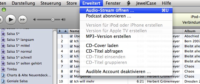Wenn ihr auf die 1000mikes-LV-Radio Seite geht: www.letzte-version.de/radio/on-air/ ...dann gibts da neben dem Player einen Link "Mit externem Player öffnen". Je nach Rechnerkonfiguration wird nach Klick auf den Link entweder automatisch iTunes geöffnet und der Stream abgespielt oder ihr fügt den Link manuell ein. Dazu geht ihr im Menue auf Erweitert -> Audio-Stream öffnen... ...und tippt als Adresse die hier ein: http://streaming2.1000mikes.com/groe...?encoding=mpeg Vllt. kann jemand anders dieselben Schritte für Winamp aufschreiben? |