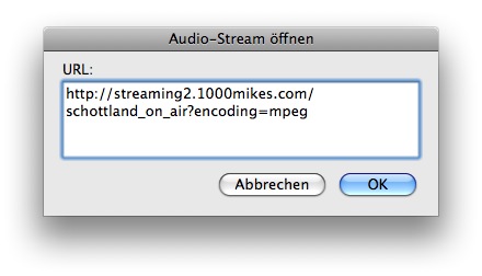 Der Kanal "Schottland on Air" wird sich sicherlich über den Traffic freuen, aber die Grönemeyer-Fans bekommen unter der URL nicht das Konzert zu hören. Die richtige URL lautet: http://streaming2.1000mikes.com/groe...?encoding=mpeg Beste Grüße, Kay von 1000MIKES |