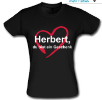 Also meinen Entwurf habe ich jetzt auf einem Herren-Shirt gemacht. Aber zugegebenermaßen würde ich als Mann nicht mit dem Herzchen rumlaufen wollen. Man(n) kann es ja auch ganz einfach ohne Herzchen bestellen, und vielleicht auch ohne Herbert oder einen ganz anderen Frontaufdruck. Fänd es halt schön, wenn wenigstens Rückseite und Ärmelaufdrucke bei allen gleich wären. Statt des Herzchens könnten die Männer ja auch z.B. das Geschenkpäckchen nehmen.