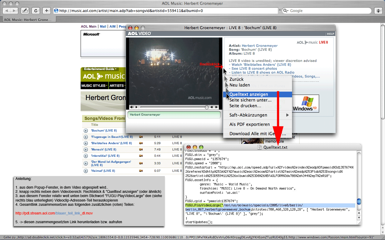 nachdem ich den quelltext dieser aol-seiten, auf denen man herberts auftritt beim live8-konzert anschauen kann, genauer betrachtet habe, hab ich eine sehr simple möglichkeit entdeckt, die clips auf festplatte abzuspeichern. man klicke einfach rechts auf die jeweiligen folgenden links und "speichere unter".