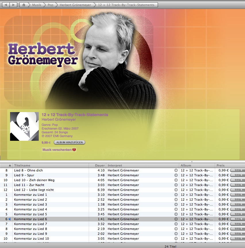 Im iTunes-Store kann man sich das Album 12 als "12 + 12 Track-By-Track-Statements" kaufen. Darin enthalten sind zusätzlich zum Album die in diesem Thread (gekürzt) und im Songbuch (vollständig) zu findenden Kommentare als Original-Ton von Herbert!