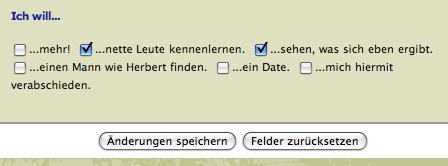 Gleich mal was ankreuzen. Mhmm, kann ich anstatt 'nen Mann wie Herbert' nen 'Mann wie Matthew'? Nee? Schade. na dann was kann man wollen? Schokolade! Nen One-Night Stand. ![]() Ich versuche noch etwas kreativer zu werden....