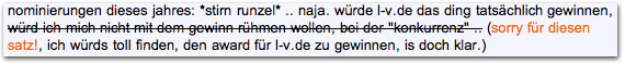 ich finde es völlig okay, wenn christian "werbung" für die neo-award-nominierung macht - das würde doch ausnahmslos jeder von uns tun !!! man wäre ja auch schön blöd, wenn man die nominierung verheimlicht - ich hätte wohl nie davon erfahren, wenn nicht hier auf der seite. vielleicht ist es etwas weit her geholt, aber wenn es einen user-award zu gewinnen gäbe, dann würde doch wohl jeder um die gunst von möglichst vielen leuten buhlen, und das sähe sicher nicht so "zurückhaltend" aus wie christians hinweis auf die nominierung ich würde mich freuen, wenn letzte-version.de gewinnt. sicher kann man sich nichts für den award kaufen, aber darum geht es doch auch nicht. es ist eine nette anerkennung für massig viel zeit und leidenschaft, die christian in dieses projekt gesteckt hat und noch immer steckt. und ich als user wäre da auch etwas stolz drauf, ein klitzekleiner, unwichtiger teil des ganzen zu sein ich drück dir die daumen, christian! so, wer will, kann weiter motzen ...