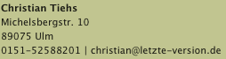 Ihr Vertrauen ist uns wichtig. Daher möchten wir Ihnen jederzeit Rede und Antwort bezüglich der Verarbeitung Ihrer personenbezogenen Daten stehen. Wenn Sie Fragen haben, die Ihnen diese Datenschutzerklärung nicht beantworten konnte oder wenn Sie zu einem Punkt vertiefte Informationen wünschen, wenden Sie sich bitte jederzeit an Christian Tiehs (Kontaktmöglichkeiten siehe oben).